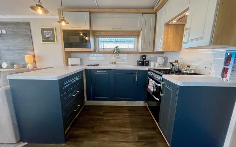 2023 ABI Keswic new caravan for sale on site in Cornwall, 36 by 12 foot model with 2 bedrooms, open plan living space with comfy sofas and modern kitchen plus decking to the front and side.