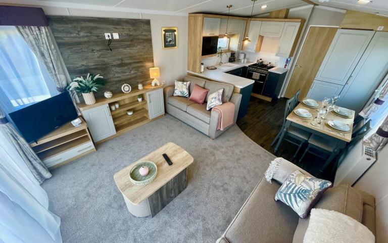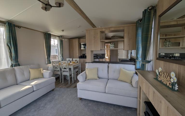 2023 ABI Roecliffe static caravan for sale on site in Cornwall, 37 by 12 foot model with 2 bedrooms, modern kitche and large lounge with free standing sofas and outside decking area.