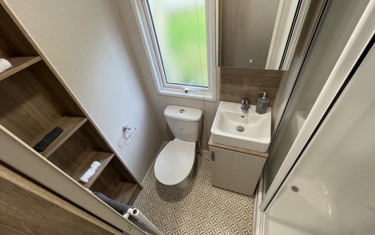 This holiday home also includes a main modern bathroom with a shower, toilet, and basin. There is plenty of storage in the bathroom mirror cabinet, under sink cupboard and a shelving unit for toiletries and towels, and a heated towel rail.