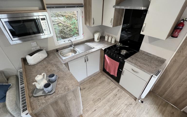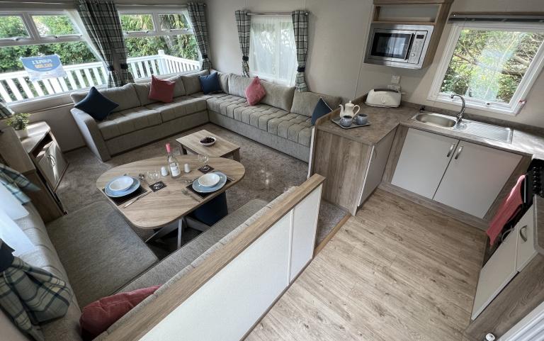 Inside, the ABI Keswick is created with relaxation and recreation in mind. The bright living area is open plan, providing a comfortable area for entertaining, dining, and relaxing. The clean and modern kitchen has all the appliances you need to create delicious meals, including a fridge-freezer, oven, hob, and microwave.